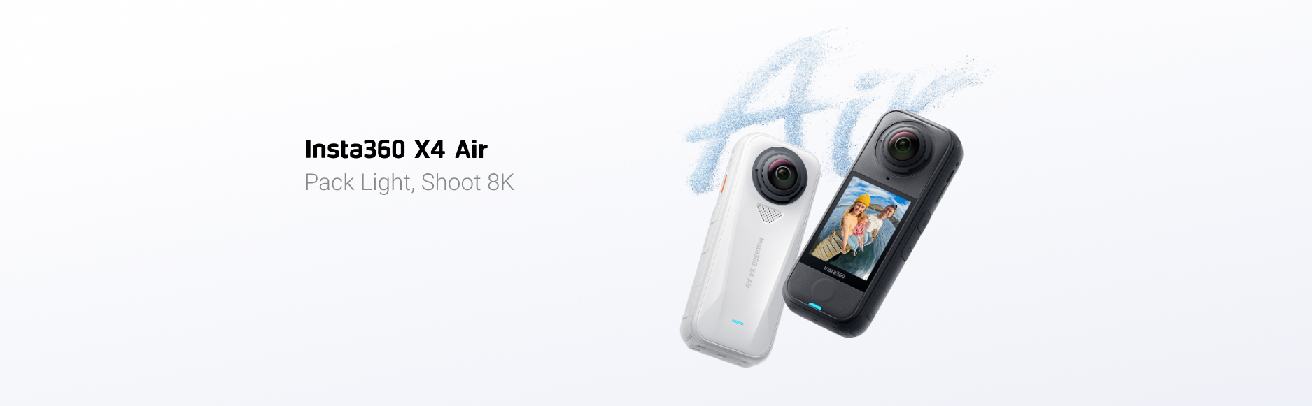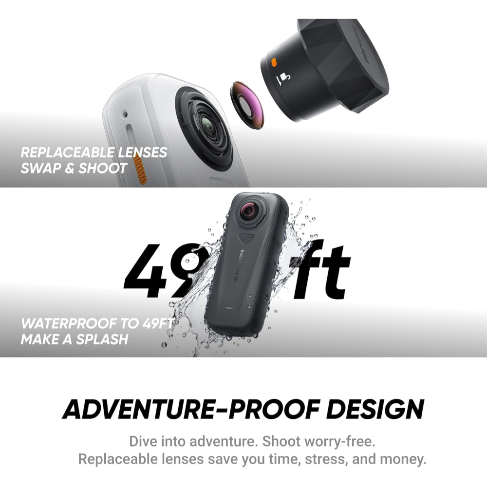 Pack Light, Shoot 8K. The Insta360 X4 Air is your go-anywhere 360 action camera—ultra-light at just 165 g yet powerful enough to capture stunning 8K footage. From mountain trails to family adventures, it delivers pro-level stabilization, vivid HDR detail, and intuitive AI editing. Replaceable lenses and a built-in wind guard make it tough and worry-free, while the free Insta360 app helps you turn every moment into share-ready magic. X4 Air Starter bundle comes with the X4 Air camera and accessories: Extra battery, 114cm Invisible Selfie Stick, Lens Cap, USB-C Cable, Protective Pouch, and Lens Cloth. The X4 Air brings flagship performance at the best value—light, portable, and fun to use.